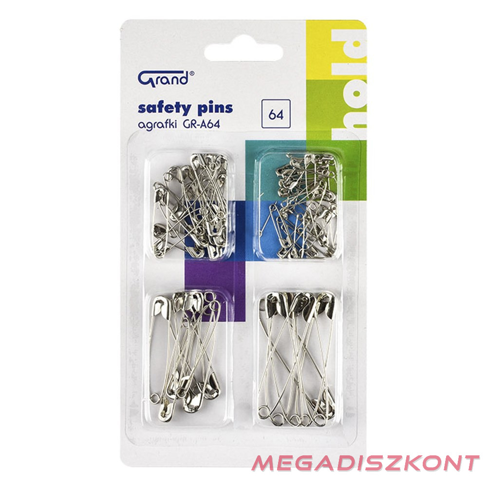 64 darabos biztosítótű készlet. A készlet 4 külböző méretű biztosítótűt tartalmaz. Csomag tartalma: 30db-2cm, 20db-3cm, 8db-4,5cm, 6db-5,5cm.