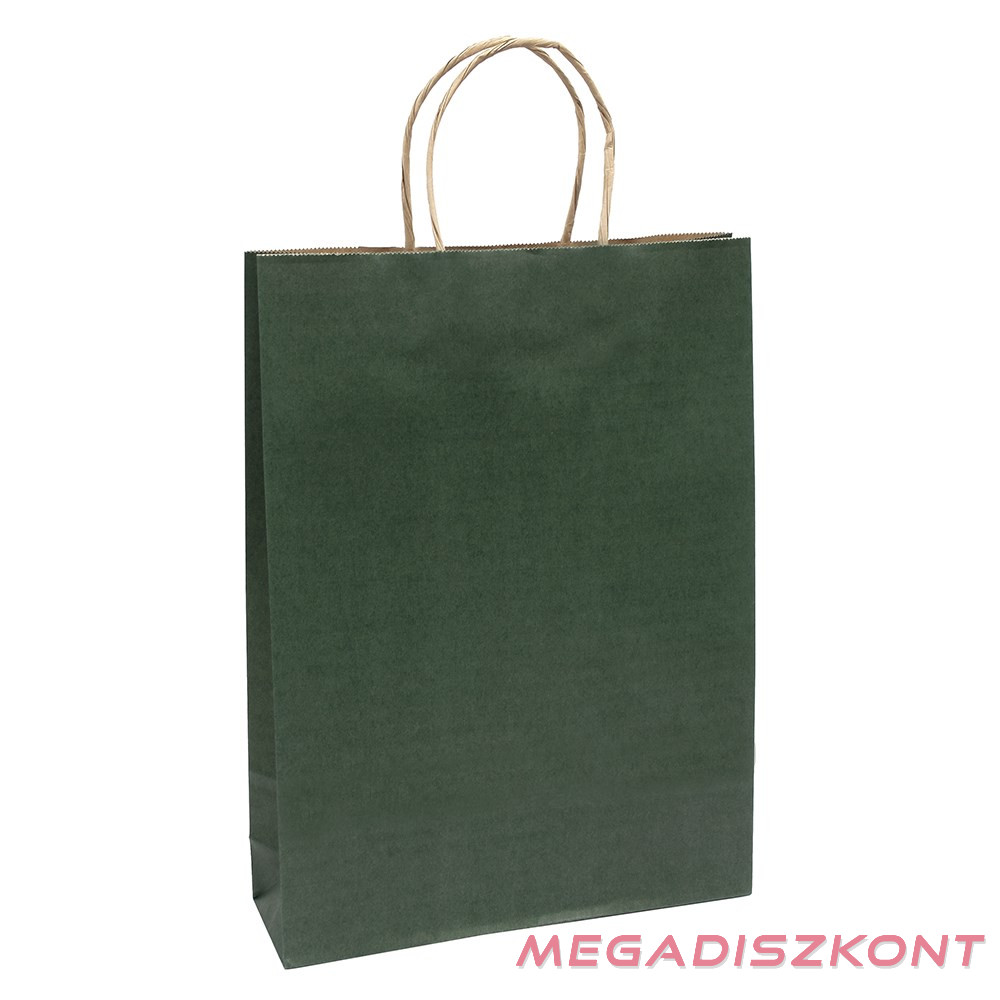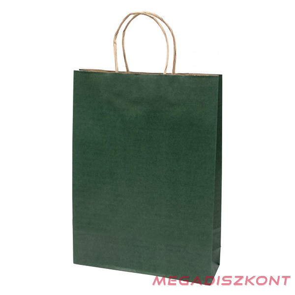 Ajándéktasak, L 26x35x8 cm méretben, sötétzöld színben, sodort füles.