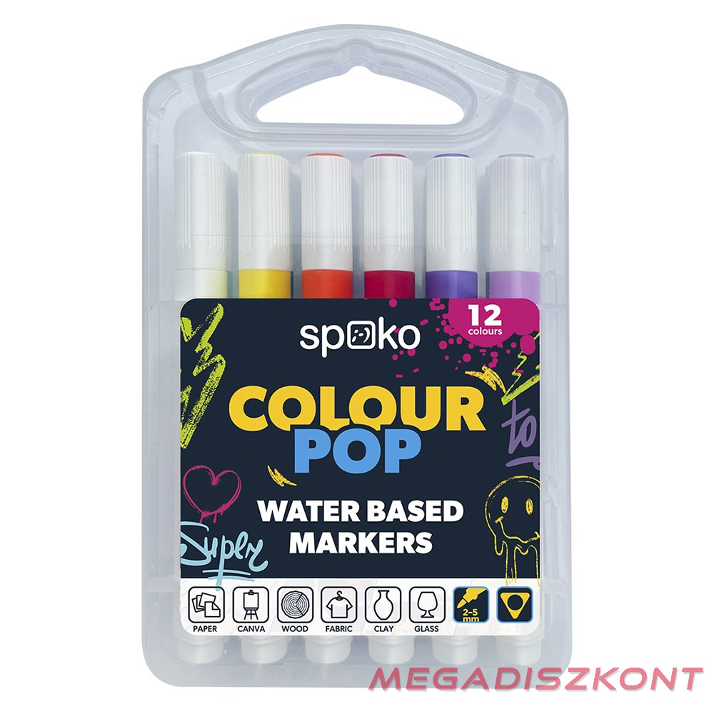 Legyen SPOKO, legyen COLOUR POP! Gyorsan száradó, vízbázisú marker készlet. Kerek, közepes heggyel univerzális, háromszög alakú testtel a kényelmes fogásért. Szellőző kupak és praktikus, merev tok a tároláshoz. 12 élénk szín, mely többféle felületre alkalmas - kavicsoktól a vászonon, textil anyagokon, fán vagy sima papíron át.