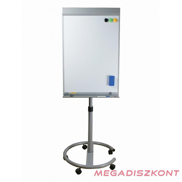 Mobil flipchart tábla. Mágneses, fehér, lakozott borítás, ízléses ezüst műanyag keretbe foglalva. A tábla méretei 70x100 cm, állítható magassággal (maximum 220 cm). A termék mobilitását szolgáló állvány 5 kerékből 3 blokkolható a stabilitás érdekében. Továbbá 68 cm széles marker tartó tálcával van ellátva, amelyre flipchart markereket lehet helyezni. Kizárólag beltéri használatra alkalmas.