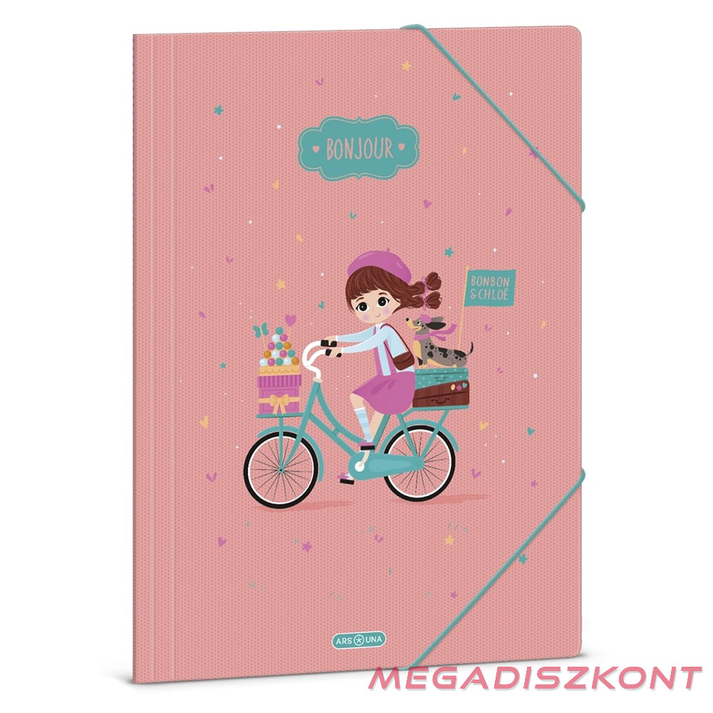 A/4 méretű gumis dosszié iratok, füzetek tárolására. 350 gr-os vastag kartonból készült dosszié lekerekített első sarkokkal, színes gumi zárópánttal. Külseje négy színnel, fényes fóliával nyomott. Belső oldala nyomatlan.