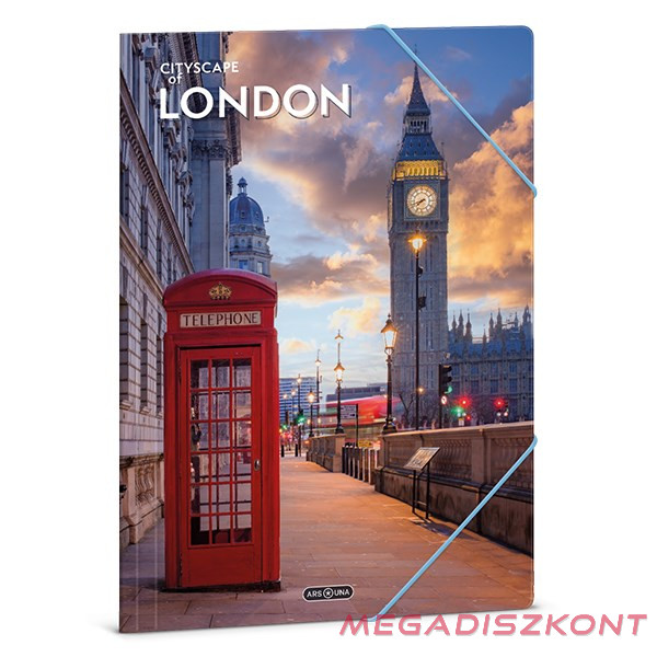 A/4 méretű gumis dosszié iratok, füzetek tárolására. 350 gr-os vastag kartonból készült dosszié lekerekített első sarkokkal, színes gumi zárópánttal. Külseje négy színnel, fényes fóliával nyomott. Belső oldala nyomatlan.