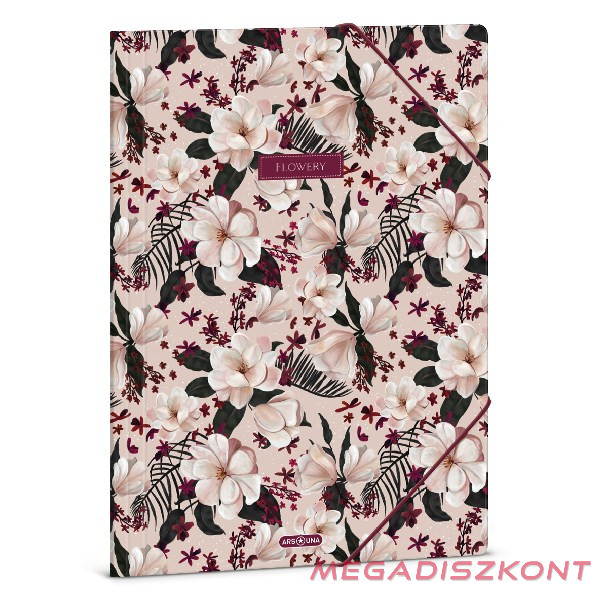 A/4 méretű gumis dosszié iratok, füzetek tárolására. 350 gr-os vastag kartonból készült dosszié lekerekített első sarkokkal, színes gumi zárópánttal. Külseje négy színnel, fényes fóliával nyomott. Belső oldala nyomatlan.
