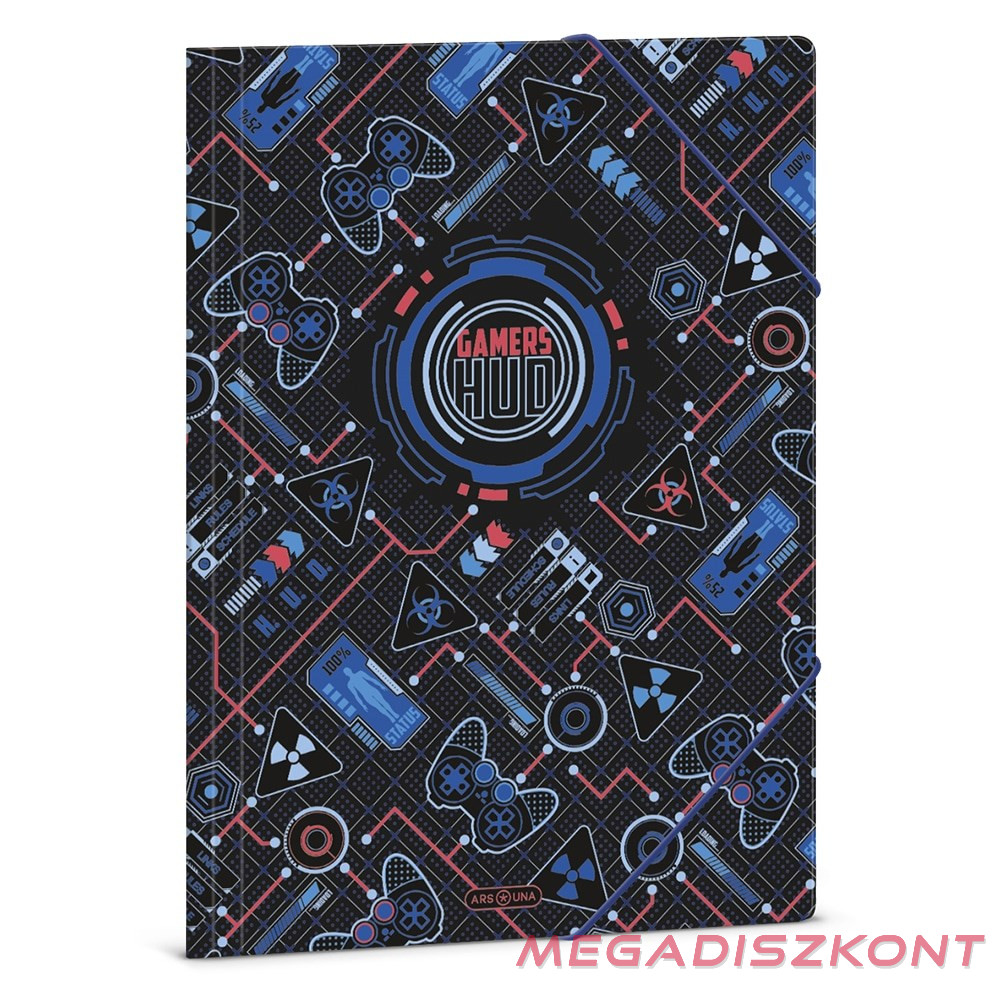 A/4 méretű gumis dosszié iratok, füzetek tárolására. 350 gr-os vastag kartonból készült dosszié lekerekített első sarkokkal, színes gumi zárópánttal. Külseje négy színnel, fényes fóliával nyomott. Belső oldala nyomatlan.