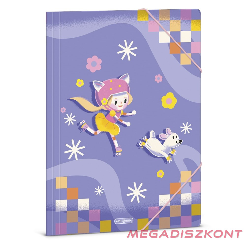 A/4 méretű gumis dosszié iratok, füzetek tárolására. 350 gr-os vastag kartonból készült dosszié lekerekített első sarkokkal, színes gumi zárópánttal. Külseje négy színnel, fényes fóliával nyomott. Belső oldala nyomatlan.