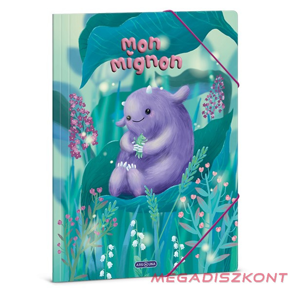A/4 méretű gumis dosszié iratok, füzetek tárolására. 350 gr-os vastag kartonból készült dosszié lekerekített első sarkokkal, színes gumi zárópánttal. Külseje négy színnel, fényes fóliával nyomott. Belső oldala nyomatlan.