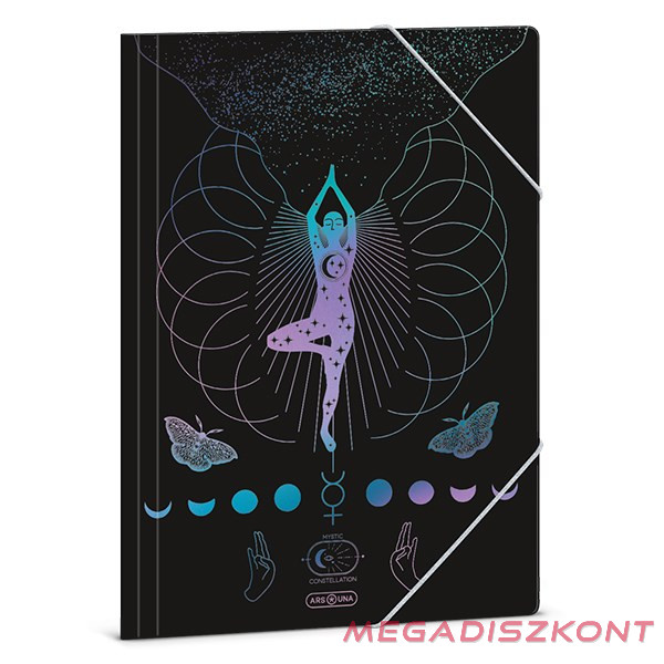 A/4 méretű gumis dosszié iratok, füzetek tárolására. 350 gr-os vastag kartonból készült dosszié lekerekített első sarkokkal, színes gumi zárópánttal. Külseje négy színnel, fényes fóliával nyomott. Belső oldala nyomatlan.