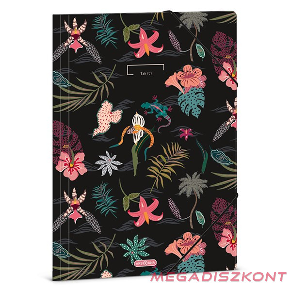 A/4 méretű gumis dosszié iratok, füzetek tárolására. 350 gr-os vastag kartonból készült dosszié lekerekített első sarkokkal, színes gumi zárópánttal. Külseje négy színnel, fényes fóliával nyomott. Belső oldala nyomatlan.