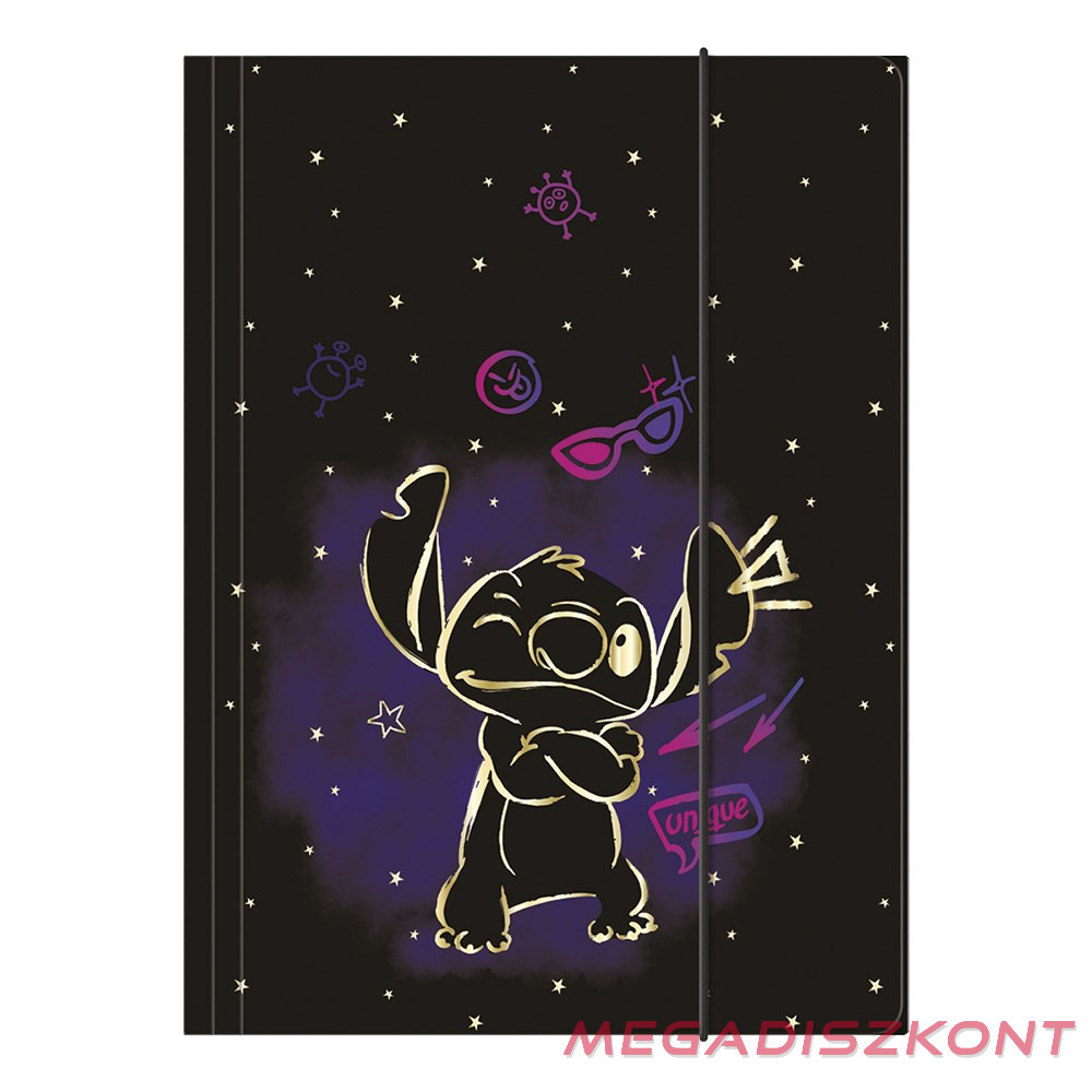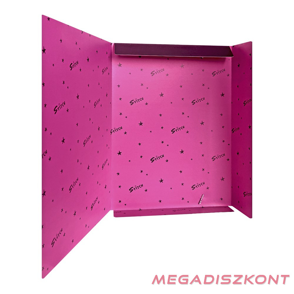 Gumis mappa vidám, Stitch mintával, kerek gumiszalaggal, kontrasztos színű, mintás belső oldallal. Használható iskolában pl.: rajzok és füzetek tárolására, vagy egyéb dokumentumok hordására.