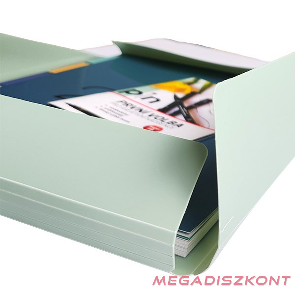 Praktikus mappák az otthoni vagy irodai dokumentumok gyors archiválásához. 3 belső füle megakadályozza a dokumentumok kiesését a mappából. A mappa színével megegyező színű, kerek gumiszalag erős záródást biztosít. A kiváló minőségű és tartós kivitelezés megvédi a tartalmat a szennyeződéstől vagy a sérüléstől. Formátuma: A/4. Anyaga: 100% újrahasznosított PP, 230 qm. Méretei: 32 x 24 cm. SoftTouch felület. Global Recycled Standard tanúsítvány