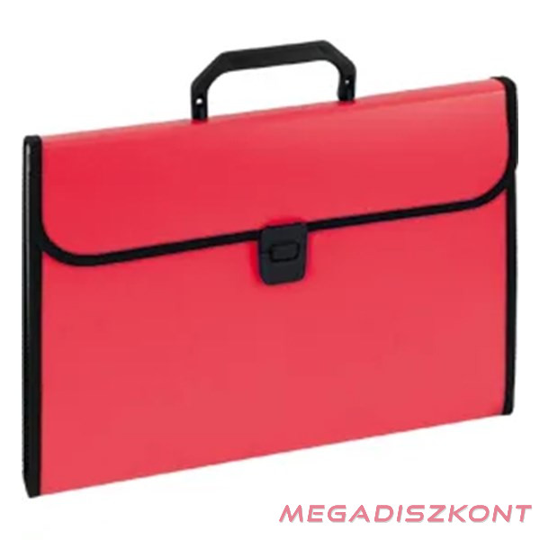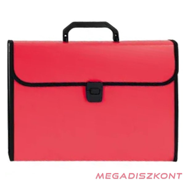 Műanyag, egyszínű irattartó mappa 12 tárolórekesszel, elején műanyag csattal, füllel ellátott. Kézitáska jellegű forma kialakítással.