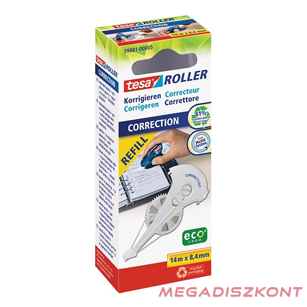 A tesa® környezetbarát újratölthető hibajavító rollerrel egy hibás szövegrész javítása gyors és könnyű. Egyszerűen nyomja rá a rollert a papírra az ultravékony öntapadó filmcsík felviteléhez. Tiszta és nem feltűnő módon lefed bármilyen hibát vagy nem megfelelő szöveget. A fehér szalag nem csak a kézzel írott (javasolt méret: 8,4mm), hanem a nyomtatott szövegrészeket (javasolt méret: 4,2mm) is elfedi. Írni is lehet rá közvetlen javításként. A roller 100 %-ban újrahasznosított műanyagból készült (ház), és bármilyen megfelelő tesa® javítószalaggal utántölthető.