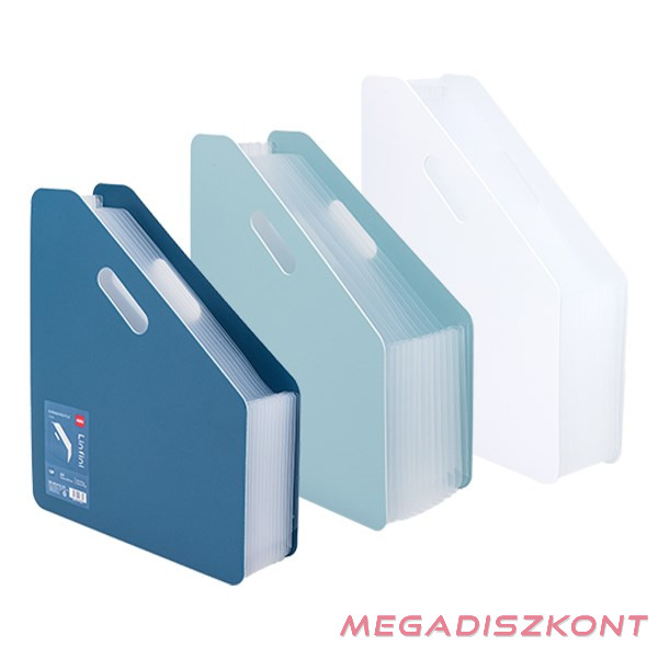 Ideális megoldás dokumentumok, magazinok elválasztására. Feliratozható-13 rekeszes, fekvő kivitel. Szélesíthető max 20cm. Merev, tartós fogantyúk a könnyű szállításhoz. LINFINI pasztell színek: kék, zöld, fehér