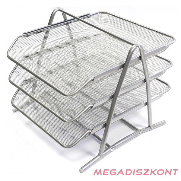 Fémhálós kivitelű háromszintes irattartó tálca, A/4 -es méretű iratok tárolására, ezüst színben