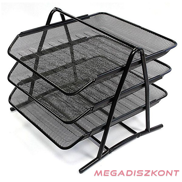 Fémhálós kivitelű háromszintes irattartó tálca, A/4 -es méretű iratok tárolására, fekete színben