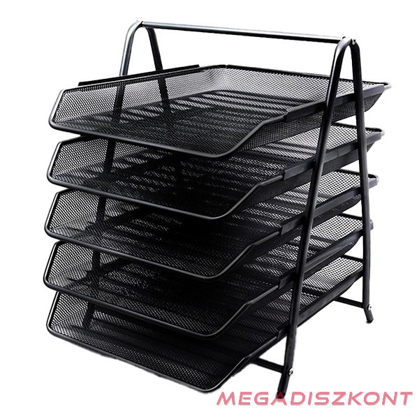 Fémhálós kivitelű ötszintes irattartó tálca, A/4 -es méretű iratok tárolására, fekete színben