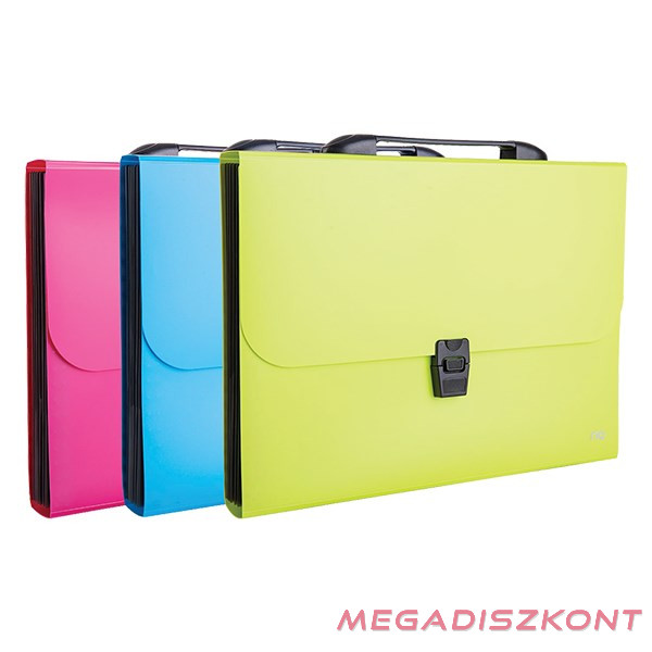 Rendszerezze és tárolja fontos dokumentumait a harmonika irattáskában. Ergonomikus fogantyú, feliratozható-különálló 7 rekeszes, A/4 méretű dokumentumok tárolására vegyes színekben: kék, zöld, piros