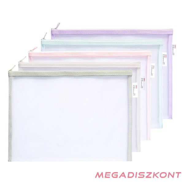 A/4 méretű dokumentumok tárolására. Anyaga 330 mikron PE , fémcipzár záródás, szövetéllel. Átlátszó, COLORFUL pasztell vegyes színekben: kék, lila, rózsaszín, zöld