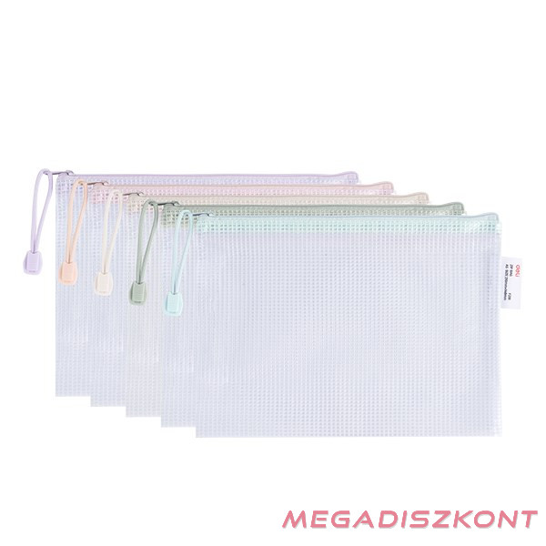 A/5 méretű dokumentumok tárolására. Anyaga 230 mikron PVC hálós-erősített, fémcipzár záródás. Átlátszó, COLORFUL pasztell vegyes színekben: kék, lila, rózsaszín, zöld
