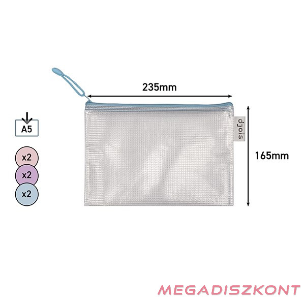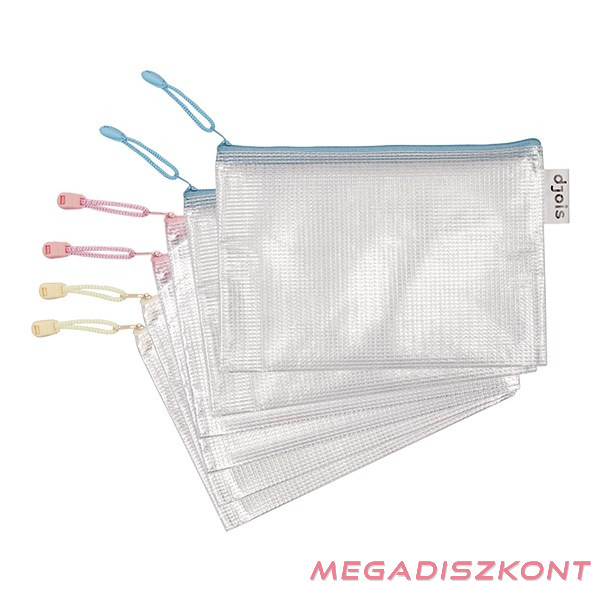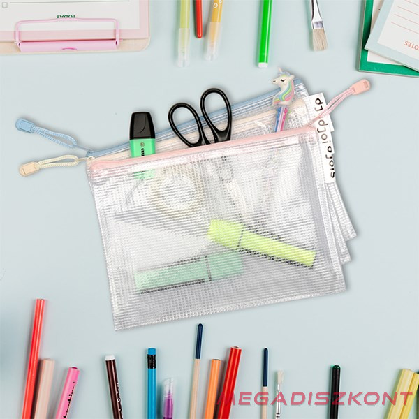 Rendkívül tartós, félig átlátszó, rugalmas hálóval erősített, tartós PVC tasak vonzó, pasztell színekben. Dokumentumok, írószerek, apró tárgyak akár tematikus rendszerezésére is alkalmas. A fém cipzáron lévő, színes zsinór megkönnyíti a használatot. Oldalán található, logós hurok toll tartására alkalmas. Formátuma: A5, külső mérete: 235 × 165 mm; tetején cipzárral. Anyaga: hálóval erősített, tartós PVC (230 µm), pasztell színek vegyesen: sárga, rózsaszín, kék. Szakadásbiztos, REACH-kompatibilis, ftalát mentes. Szín nem választható.