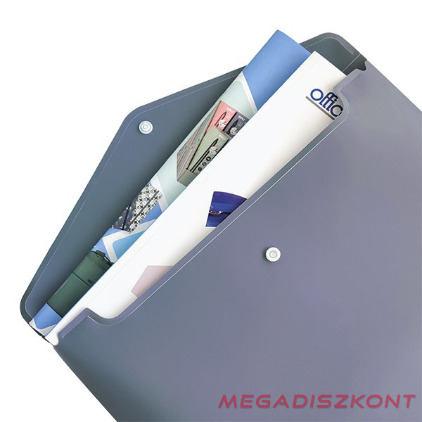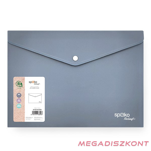Praktikus, nem átlátszó irattartó tasak, mely különböző dokumentumok tárolására és hordására alkalmas. A könnyen zárható patent a tasak színével harmonizál. Formátuma: A4. Anyaga: 100% újrahasznosított PP, 230 µm. Méretei: 33 × 23,5 cm. SoftTouch felület. Global Recycled Standard tanúsítvány.