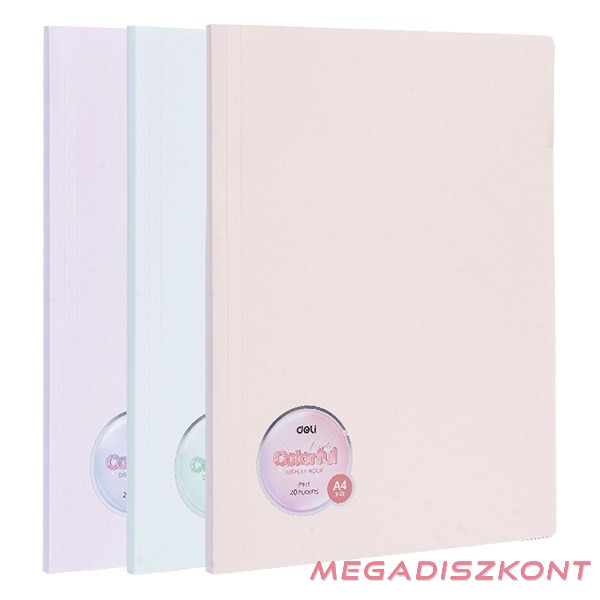 Szórólapok, árlisták, ajánlatok átadására, tárolására. 180°-ban nyitható. Anyaga PP, bársonyos-puha tapintás. 30 zsebes változat, COLORFUL pasztell vegyes színekben: kék, lila, rózsaszín