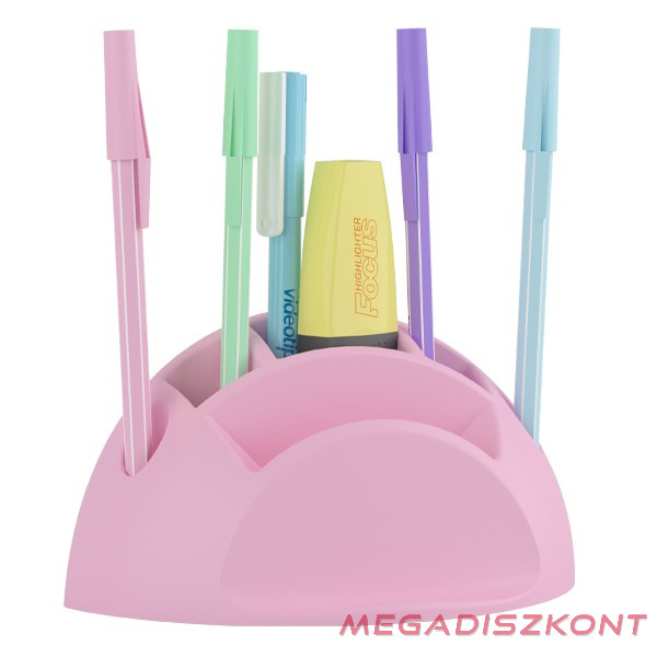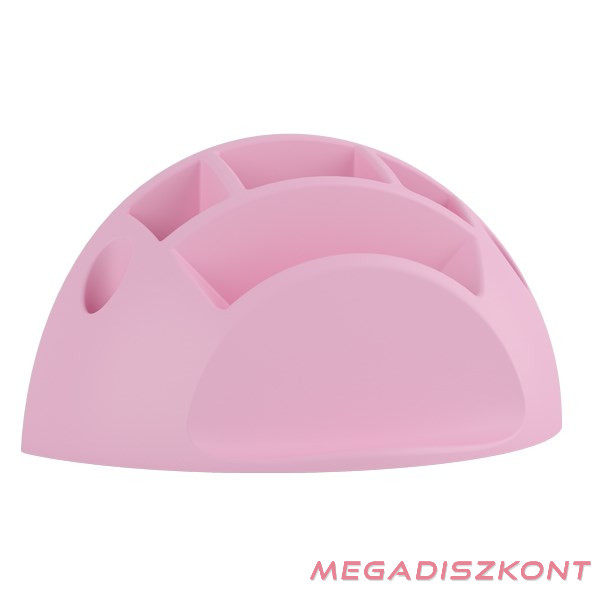Formatervezett, műanyag testű, hat rekeszes, különféle méretű jegyzettömbök tartására alkalmas asztali jegyzettömb- és írószertartó.
