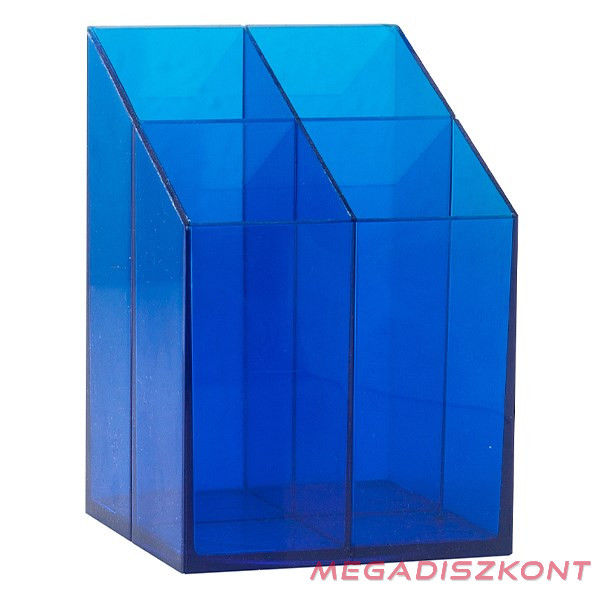 Asztali írószertartó szögletes kivitelben, 4 tárolórekesszel. Választható színek: transzparens kék, transzparens fekete. Feltöltés nélkül!