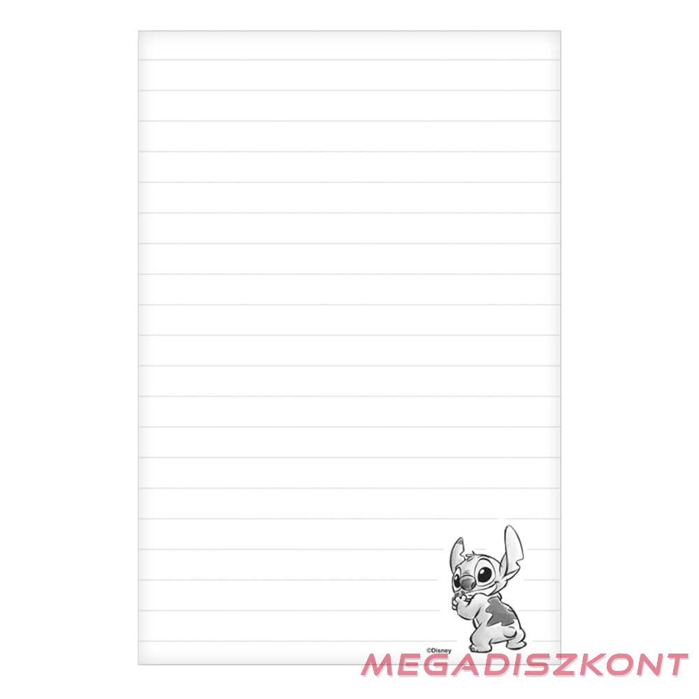 Erős, karton alapú, párnázott borítású jegyzetfüzet lapos gumiszalagos záródással. Külső borítása ellenáll a kisebb sérüléseknek, karcolódásoknak. Fehérített, vonalas lapokkal és egy kis Stitch díszítéssel a lapok jobb alsó sarkában. Használhatjuk mindennapi jegyzetekhez, napi feladatokhoz vagy naplóként egyaránt.