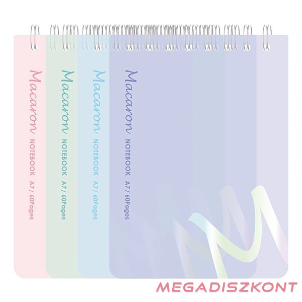 Spirálos notesz A/7. Ikerspirál, 300g-os kartonborító, 70g-os belív. MACARON pasztell színek: kék, lila, zöld, narancs