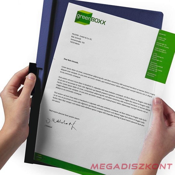 Műanyag anyagú, víztiszta előlappal, színes hátlappal, oldalán speciális elasztikus acél klippel ellátott mappa, amelyek lehetővé teszik az iratok lyukasztás nélküli lefűzését és elegáns prezentálását. A mappa maximum 30 lap lefűzésére alkalmas.