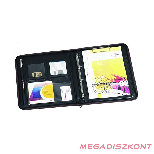 Műbőr, zippzáras záródású A/4-es méretű Fortuna konferencia mappa, 30 mm gerinszélességgel, belül praktikus tárolózsebekkel és lefűzhető felírótáblával ellátva.
