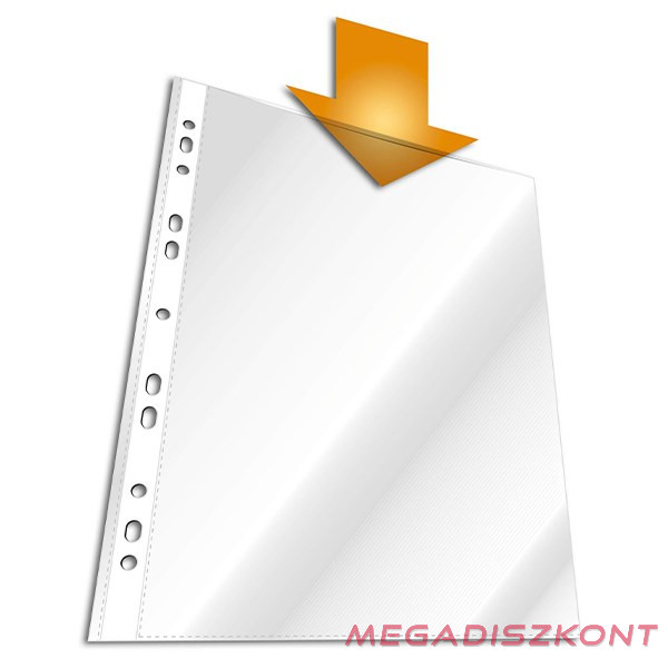 A/4, álló, felül nyitott, víztiszta, lefűzhető tasak polipropilénből. Megerősített lyukakkal. Az univerzális lyukasztásnak köszönhetően iratrendezőkbe és gyűrűskönyvekbe is lefűzhető.