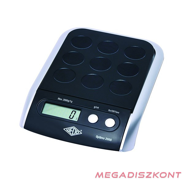 Levélmérleg, 2 kg-ig 1 g-os pontossággal mér, 4db 1,5V AAA elemmel működik, mely hozzá van csomagolva. 60mp után automatikusan kikapcsol, ha nem használjuk. LCD kijelző - számjegyek magassága 31 mm. Méret: 16x23x4 cm.
