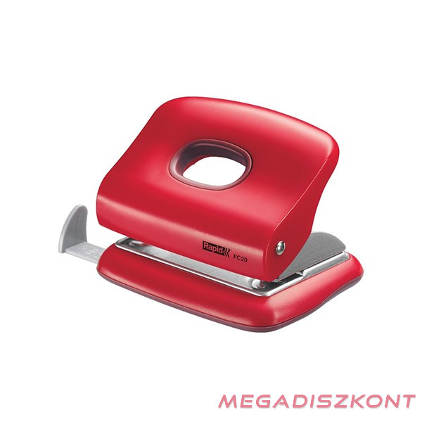 Irodai, asztali, színes műanyagvázas lyukasztó, távtartóval, papírhulladék tartóval ellátva, 20 lap lyukasztási kapacitással.
