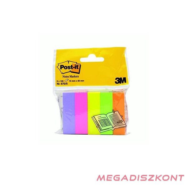 A Post-it oldaljelölő lapok tökéletesek rövid megjegyzések betűzésére, korrektúrázásra (telefonszámok, árak, hivatkozások). Írható felület, papír alapanyag. Feltűnő, 5 féle neon színű jelölő egy csomagban. Méret: 15x50 mm. 5x100 lapos.