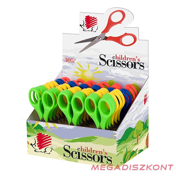 Hegyes vágóél végződésű iskolai olló. Méret: 13 cm.