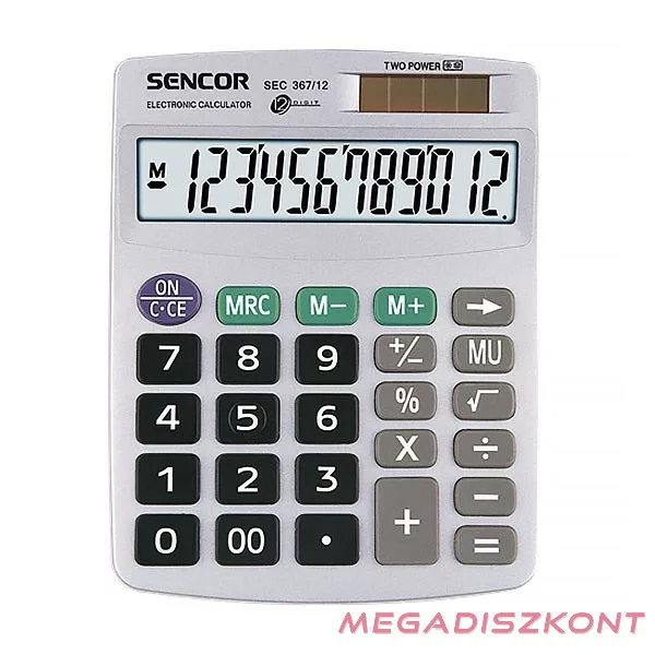 12 számjegyű kijelző, 3-kulcsos memória funkció, javítás, árrés- és százalékszámítás, ezres helyiérték elválasztó, kerekítés, elem+napelem.
