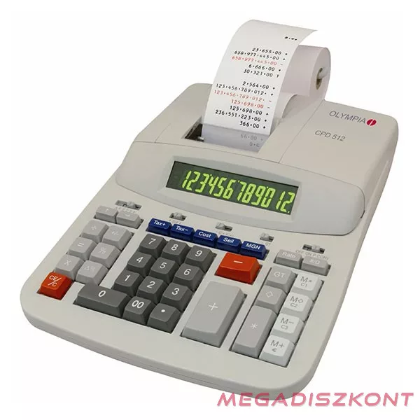 12 számjegyes kijelzős asztali számítógép Ár-elad-Margó-számítás Nyomtatás: két színes nyomtatás (fekete/piros) LCD kijelző: kapcsol-hoz zöld és piros Nyomtatási sebesség: 3,5 sor/mp. Adó kiszámítása Euro-átváltási Raktározás számla Elemszám Programozható átváltás Memória kiszámítása (Részösszeg, összesen, kivonás, kiegészítés) A kijelző, nyomtatás/elemszám üzemmód Pénznem-adó kapcsoló A görbék kapcsoló Kapcsoló decimális beállítások Részösszeg, teljes, Grand összesen Módosítása jel Százalék, Delta Nem számítógép gomb szám vagy dátum beviteli Tápellátás: 230 V / 50 Hz Papírméret: 57,5 mm ± 0,5 mm Méret: 210 x 295 x 67 mm Súly: 1.42 kg