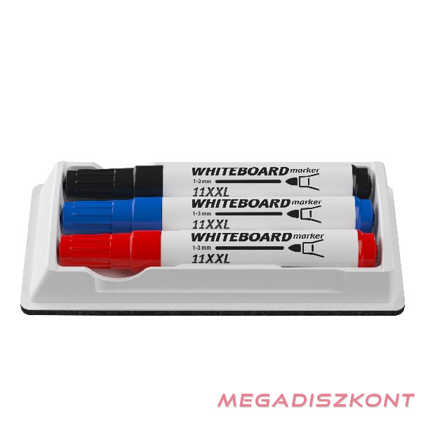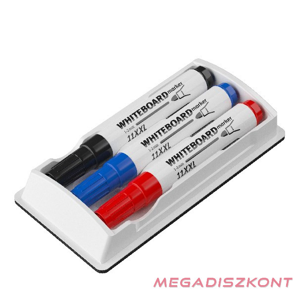 A táblatörlő tartalmaz 3 db táblamarkert kék, piros, fekete színben.