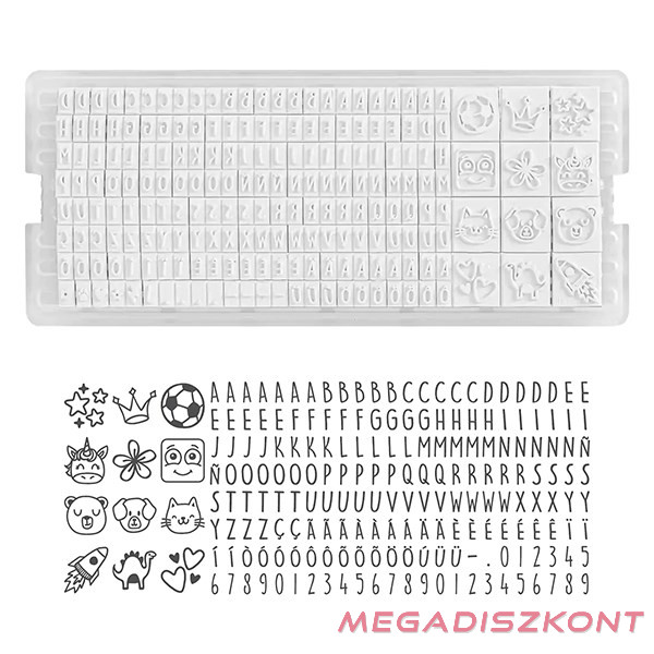 Praktikus, kirakós textil bélyegző a gyermekek ruháinak, tárgyainak megjelölésére. A betűkészletből kirakható a név, piktogramokkal színesítve.