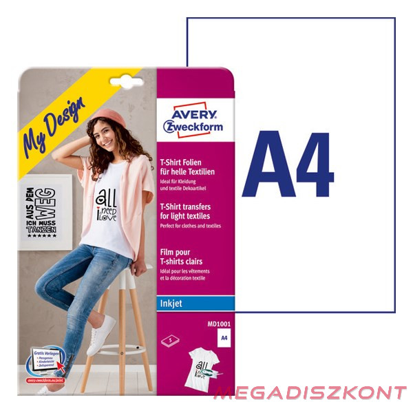 Az Avery Zweckform világos textilre vasalható fóliája minden fehér, vagy világosabb árnyalatú pamutból készült anyagra alkalmas.