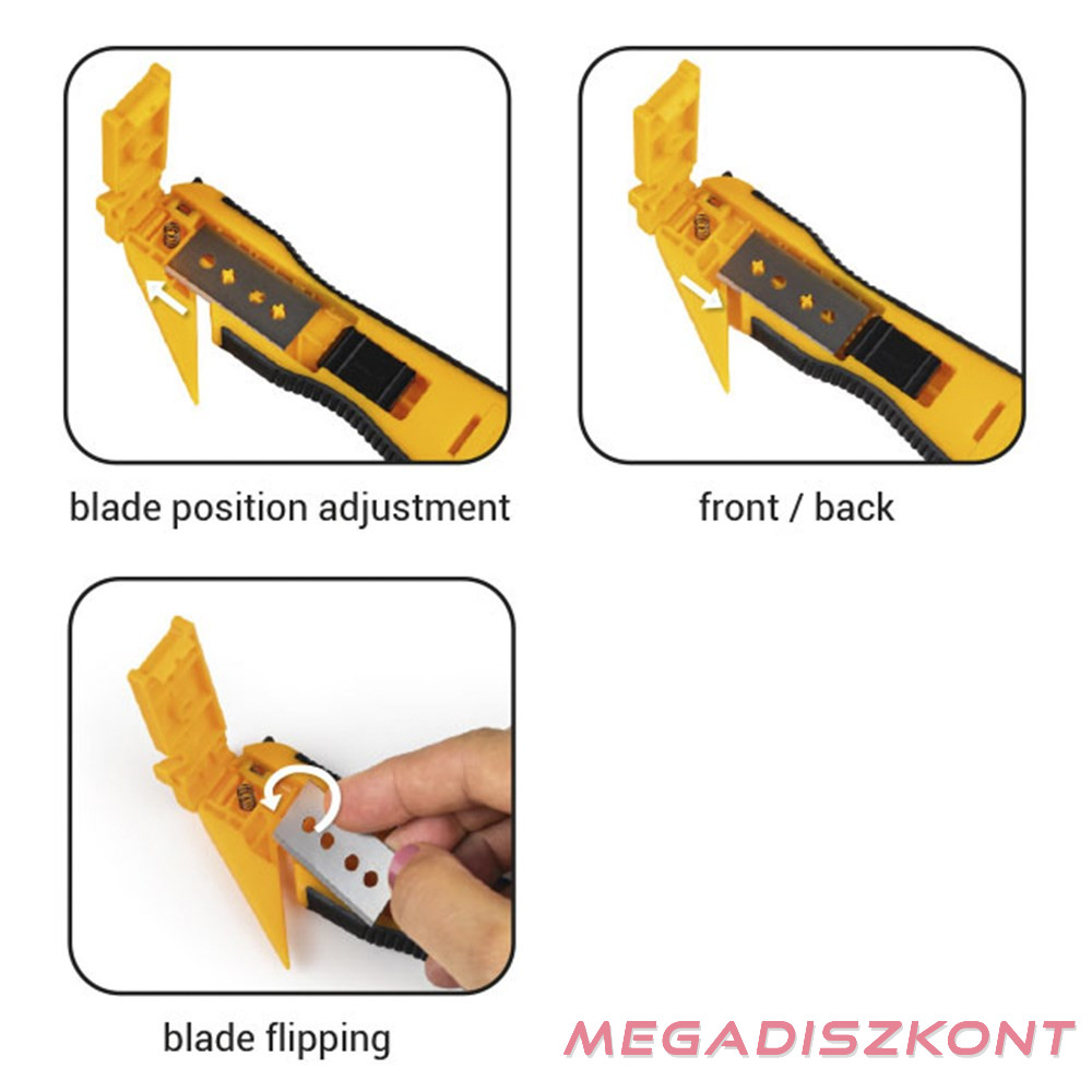 Műanyag fóliavágó 1 késsel, 2 részen használható. Cserélhető betétes.