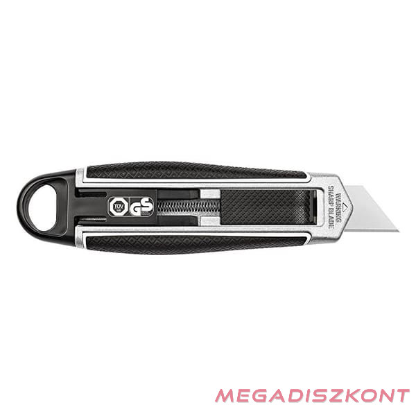 Biztonsági vágókés fém testtel, gumi fogórésszel és acél pengével balkezesek számára.