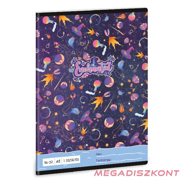 A/5-ös méretű, vonalas füzet 1. osztályos szabványos vonalazással. 32 lapos, belseje 75 gr-os papírból. Borítója 250 gr-os műnyomó kartonra lekerekített sarkokkal, fényes fóliázással, 4 szín nyomással készült. Margós.