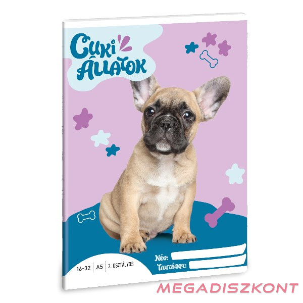 A/5-ös méretű, vonalas füzet 2. osztályos szabványos vonalazással. 32 lapos, belseje 75 gr-os papírból. Borítója 250 gr-os műnyomó kartonra lekerekített sarkokkal, fényes fóliázással, 4 szín nyomással készült. Margós.