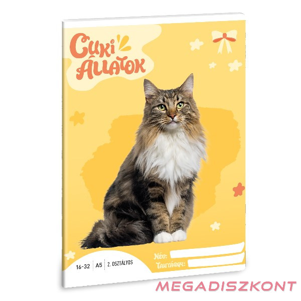 A/5-ös méretű, vonalas füzet 2. osztályos szabványos vonalazással. 32 lapos, belseje 75 gr-os papírból. Borítója 250 gr-os műnyomó kartonra lekerekített sarkokkal, fényes fóliázással, 4 szín nyomással készült. Margós.