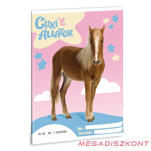 A/5-ös méretű, vonalas füzet 2. osztályos szabványos vonalazással. 32 lapos, belseje 75 gr-os papírból. Borítója 250 gr-os műnyomó kartonra lekerekített sarkokkal, fényes fóliázással, 4 szín nyomással készült. Margós.
