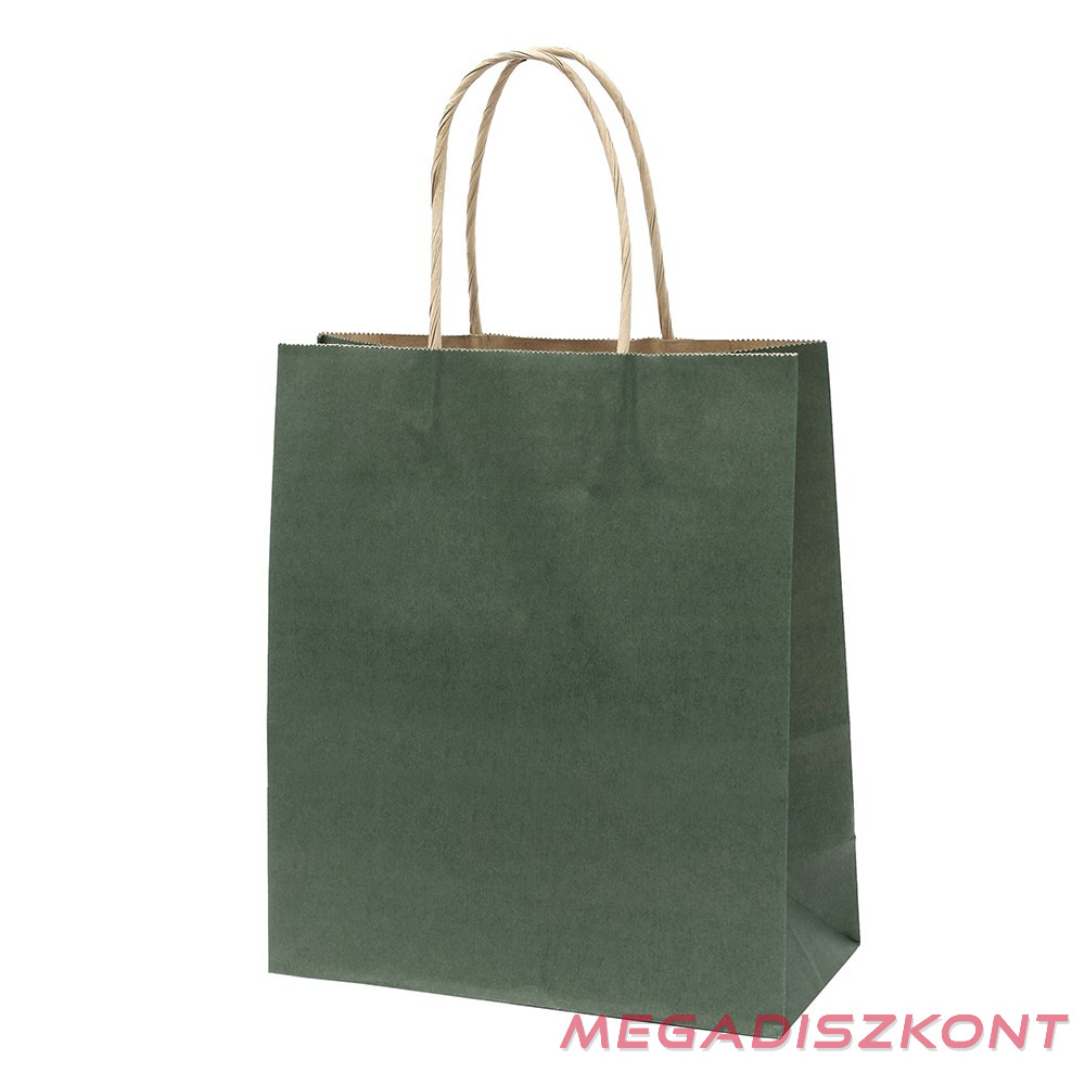 Ajándéktasak, M 22x25x10 cm méretben, sötétzöld színben, sodort füles.